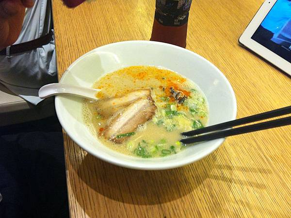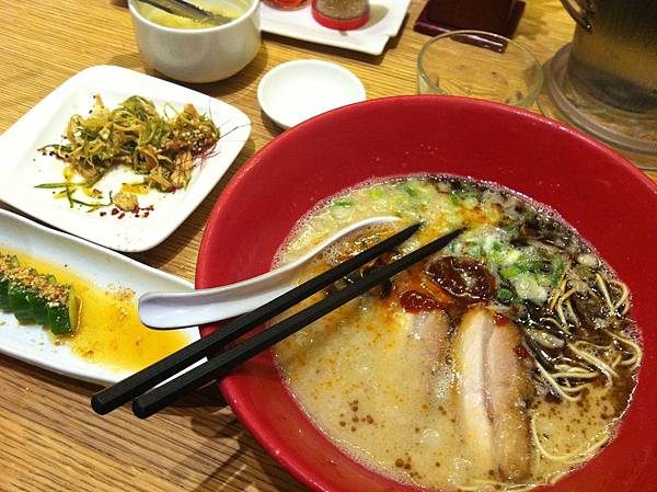 湯頭色澤很濃,但是味道沒有很鹹很重,充滿骨頭湯的香味,赤丸就加了點辣醬,其實不會辣,但是有點微辣,還有點辣醬的香味,我不會講那種味道,但是卻把豚骨的香味有點蓋過去,比較愛重口味的應該要吃赤丸。有豚骨的濃郁還有點辣醬的風味。