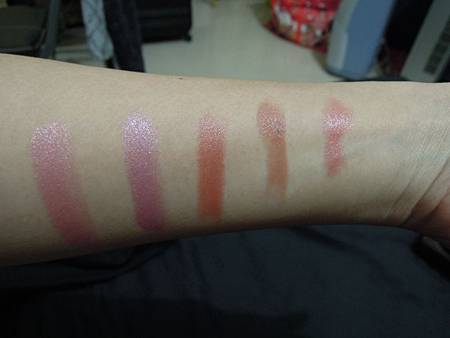 由右邊看來,右邊第一個是色號GF, 蜜桃色,淡珠光,上唇偏粉。