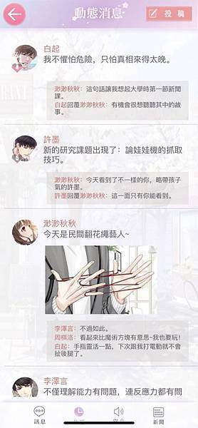 網石辣椒出品,大陸製作。廣告做得挺大,身邊幾個朋友也在玩,所以也開始跟著玩了。說真的我還停了戀愛遊戲好一陣子,但是這款介面非常可親,清淡的粉紅色,介面好操作易上手,故事不難但都很可愛,與男主角互動的介面非常生活化。留言系統也大概跟微信差不多,介面粉色粉紫色,非常好看,背景音樂也悅耳,四個人物各有特色,卡牌就是這四個人物等級分R, SR, 跟SSR 跟一般的N牌。有掃蕩功能算是很方便,破關不難但是就是要有些耐心,如果不課金也能玩。